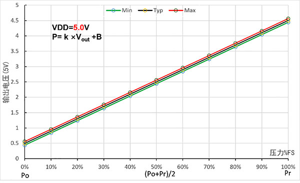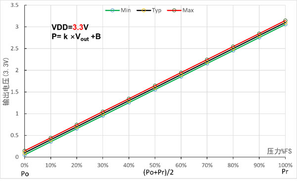 | Pr..oduct model(3.3V) | Faixa (kPa) | Tensão de saída (V) | Coeficientes e compensações | |||